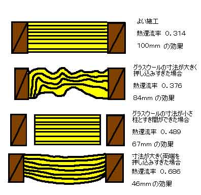 「このように 同じ厚みの断熱材でも つめ方によっては 半分以下の性能しか