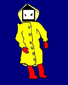 背広の上にセーターを着て 雨合羽を羽織っている