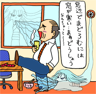 【特徴】 冬、窓や部屋の換気口から出現。床を這い住民の 足下を冷やすタイプと冷えた壁に現れ 身体の熱を 奪うタイプの2種類が居る 【強さ】 室温と窓や床、壁の温度差により変化する。 【弱点】 断熱性の良い窓や壁。熱交換換気システム。床、壁のふく射暖房 【武器】 暖房している部屋でも住人に“寒い”という不快感を与える。 【フィールド】 暖房している部屋の窓、換気口、階段、吹き抜け、断熱性能の弱 い壁などから現れる。 【目撃報告】 窓はきちんと閉まっていて暖房もしているのに、窓から冷たい風が 吹いてきて、とにかく寒い我が家です。 -マドロスさん 【ヒゲコメント】 暖かい空気は軽いので上に、冷たい空気は重いので下に移動します。 部屋の暖かい空気が冷たい窓で冷やされ重くなって床を這う気流に なり、足下に冷たさを感じるのです。(コールドドラフト現象) また、人間が感じる温度は室温と床や壁の温度の平均値なので冷たい 窓や壁、床があると体熱を奪われ寒く感じます(令ふく射) 【対策】 コールドドラフトには厚地のカーテンを床に着く長さに付け遮断する 方法があります。窓や部屋の換気口の下に暖房器具を置くのも方法です。 これから家を建てられるのであれば窓ガラスを2層にして断熱性を高め 床下の暖房機で床、壁からふく射暖房する工法なら両方解決できます。 【問い合わせ】山栄建設 084−955−770 【ところで】 家の中で一番寒い場所はどぉ〜こだ 【こたえ】 玄関(厳寒) 山栄建設 山本敏史 084−955−7700 もどる