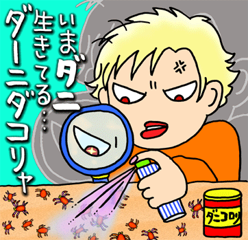 害虫怪獣 ダニー 【特徴】 体長1ミリ以下。頭部、胸部、腹部が一つに融合して、足は8本 一ヶ月で卵から一人前になる。寿命は2〜3ヶ月。 【強さ】 ダニの繁殖しやすい条件が揃うと3ヶ月間に1匹が6億匹に繁殖する。 【弱点】 乾燥、こまめな掃除、エサを与えない、産卵場所をつくらない。 【武器】 ヒョウヒダニ属の生体、死骸、フンがアレルギーの主原因になる。 皮膚に寄生して疥癬症や皮膚炎の原因となる種類も居る。 【フィールド】 布製ソファー、毛布、カーペット、ぬいぐるみ、掛け布団など 四畳半の部屋に100万匹以上居る家も 【目撃報告】 殺虫剤でダニを殺してもダニアレルーギーが治まらないんです。 -シック八苦さん 【ヒゲコメント】 ヒョウヒダニは生体、死骸、フンすべてがアレルゲンです。殺しただけでは アレルゲンの量は変わりません。また、殺虫剤は化学物質過敏症など、人体 にも影響が出る危険性があります。まず、室内からダニの量を減らしましょう。 【対策】 ダニの最も繁殖しやすい条件は、温度25〜30℃、湿度60〜80%、 餌があり、産卵できる場所です。 エサはフケ、食べかす、カビ、ホコリなどです。エサとなるものを減らすた めに風通しを良くして、こまめに掃除しましょう。 産卵場所をつくらないために、じゅうたんやカーペットを敷かず、ぬいぐるみ を置かない。ふとんやソファーの掃除、洗濯を心がけましょう。温度や湿度の 調整は難しいと思いますが、これから新築するのであれば、家じゅうの温度、 湿度をコントロールでき、ダニのエサであるカビを生えにくくする工法があり ます。 【問い合わせ】 山栄建設 084−955−770 【ところで】 食べ物の中でダニが付きやすいものはな〜んだ 【こたえ】 佃煮(付くダニ) もどる