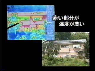 赤っぽく見える所の温度というのは、一番日射を受けて温度が高くなっている例が見られます。 屋根があり、外壁があるということが、よくおわかりだと思います。 ⇒