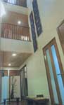 玄関ホールは小屋裏までドーンと吹き抜けに なっていて、高さ約8メートルもある。 向かって右側がLDK、左が和室となっている。 | オール電化住宅なのでキッチンの熱源もIHヒーター。 「まわりが熱くならないから料理がしやすく、キッチ ンも汚れにくいですね」と三枝子さん。 |