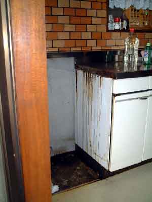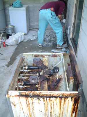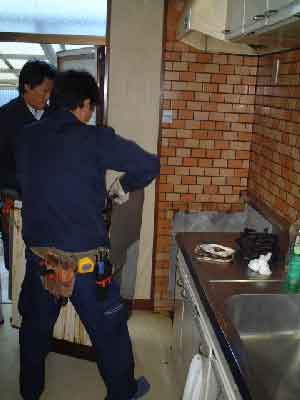 水道工事の人が温水器の基礎をつくる用意をしています。